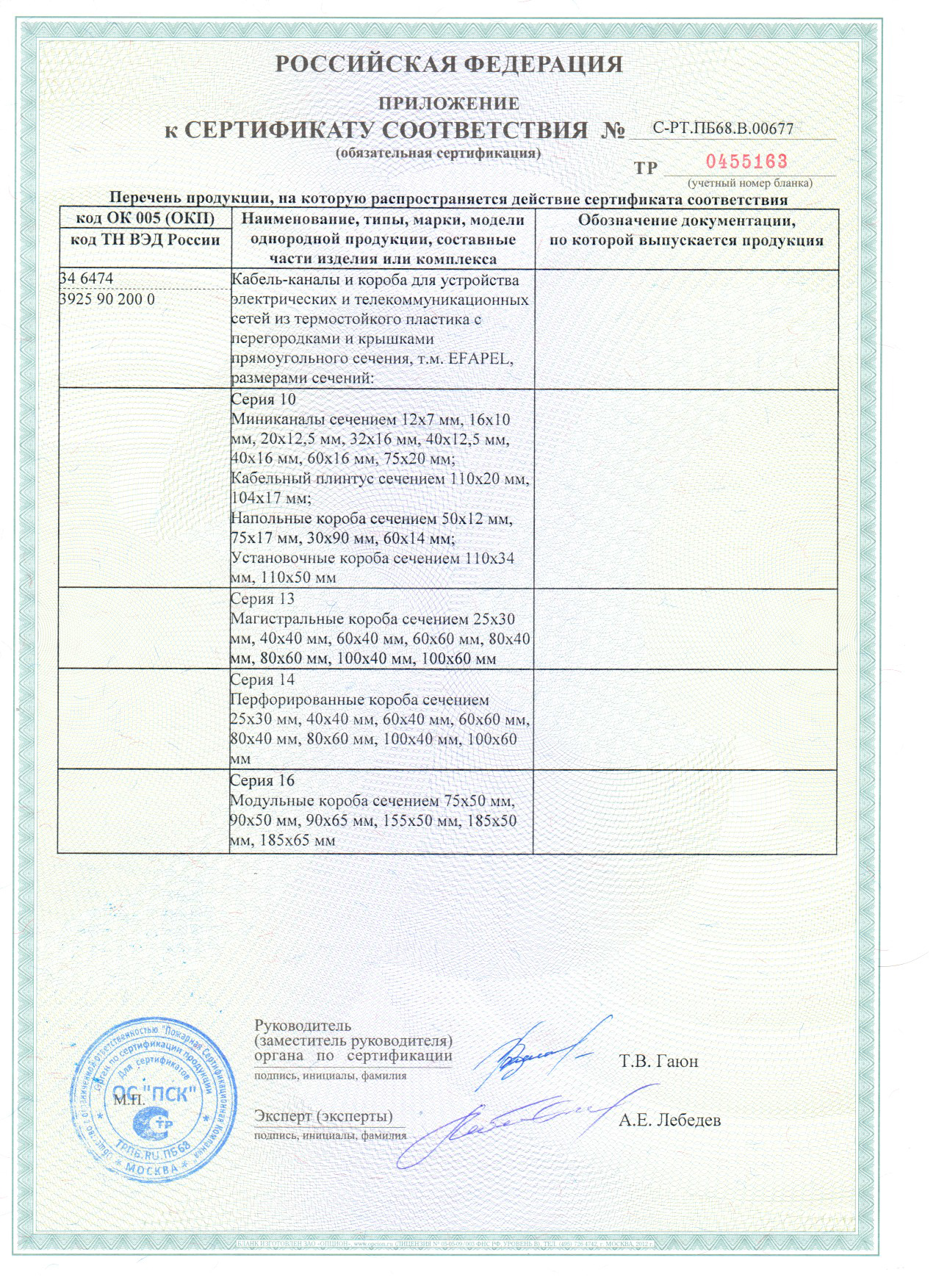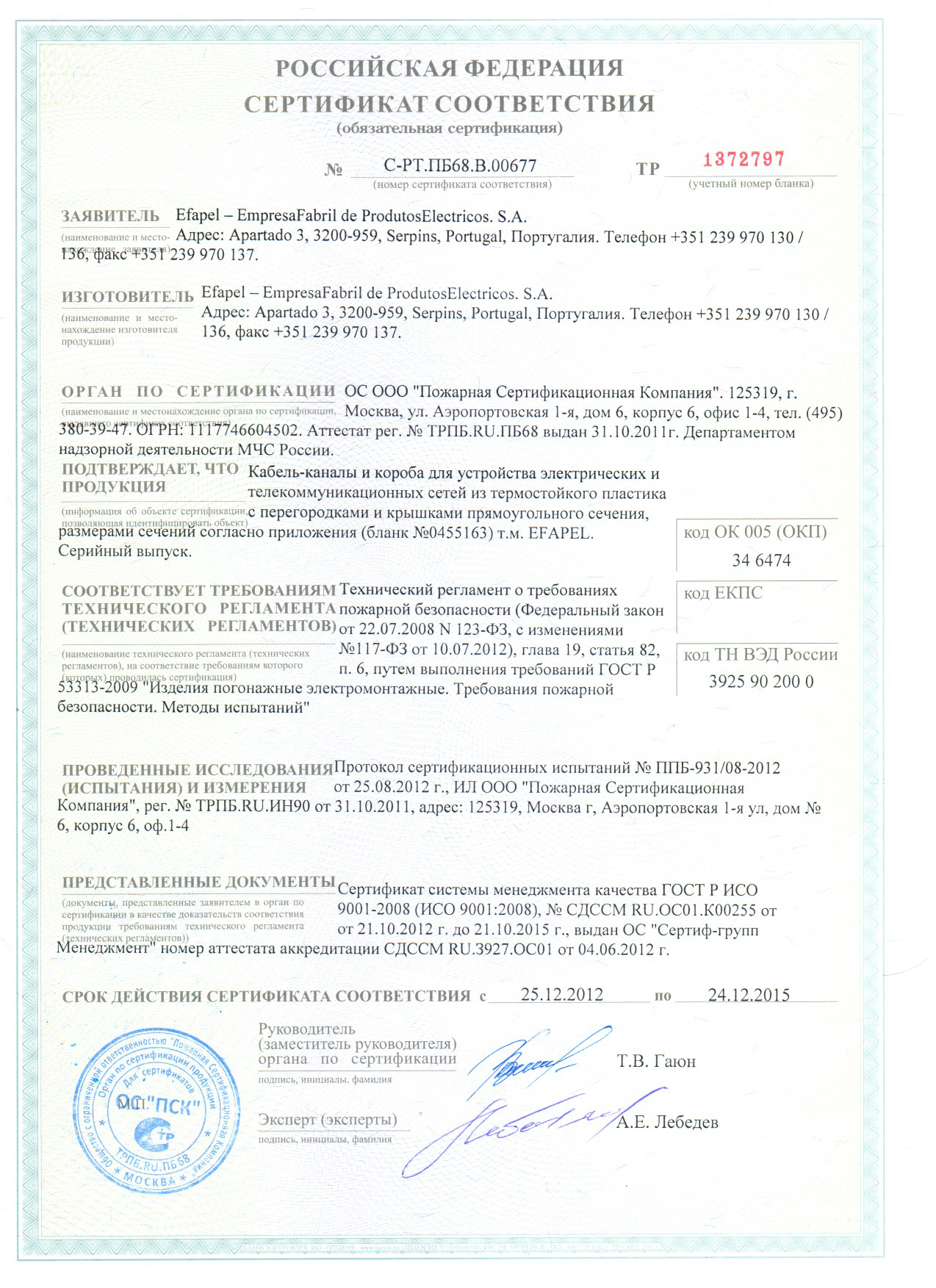 Сертификат на кабельный канал Efapel
